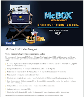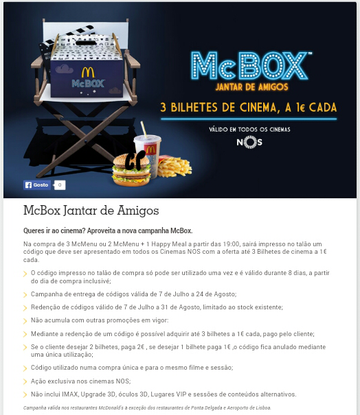 Só precisam jantar no Mac, pedindo a Mac Box e recebem um talão que dá direito a 3 bilhetes de cinema por apenas 1€ cada.
